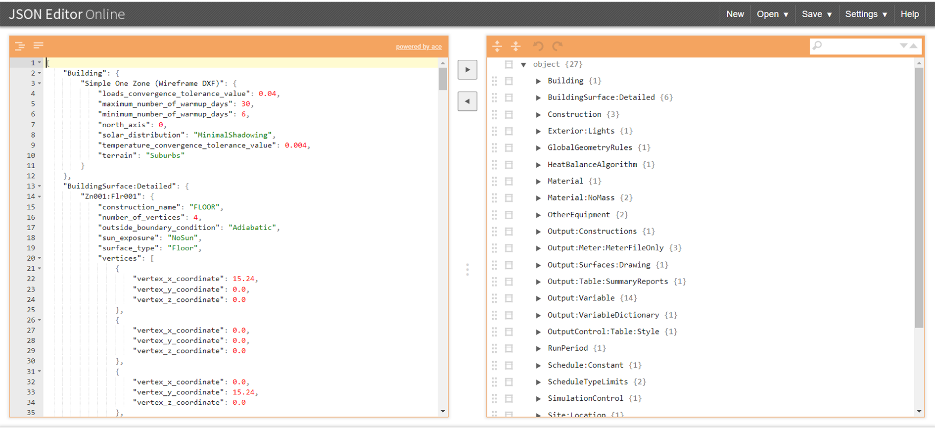 I use the JSON Editor Online chrome extension which is a Chrome app of the JSON Editor Online website. This provides a useful method of navigating the JSON files through expanding and collapsing the various JSON objects, as shown in the right-hand pane below. Similar to before, this allows the epJSON object to be opened, changes to be made manually and the modified file to be saved.